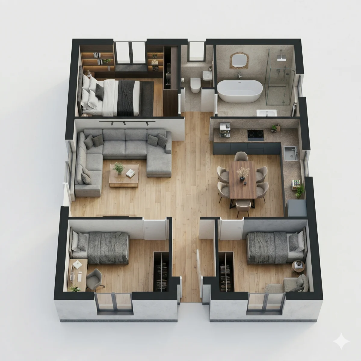 Az átgondolt alaprajz révén ideális választás lehet két gyermekes családoknak, fiatal pároknak.vagy azoknak, akik fontosnak tartják a külön vendégszoba meglétét.